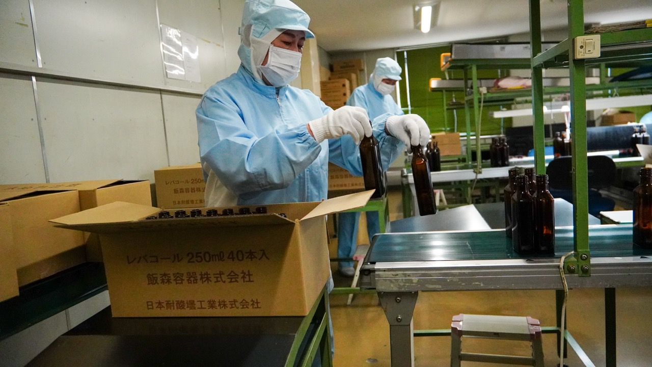 ガラスびんの検査や箱詰めは、品質を守るうえで欠かせない重要な工程です。当社では、一人ひとりが責任を持ち、集中して業務に取り組める環境を整えています。